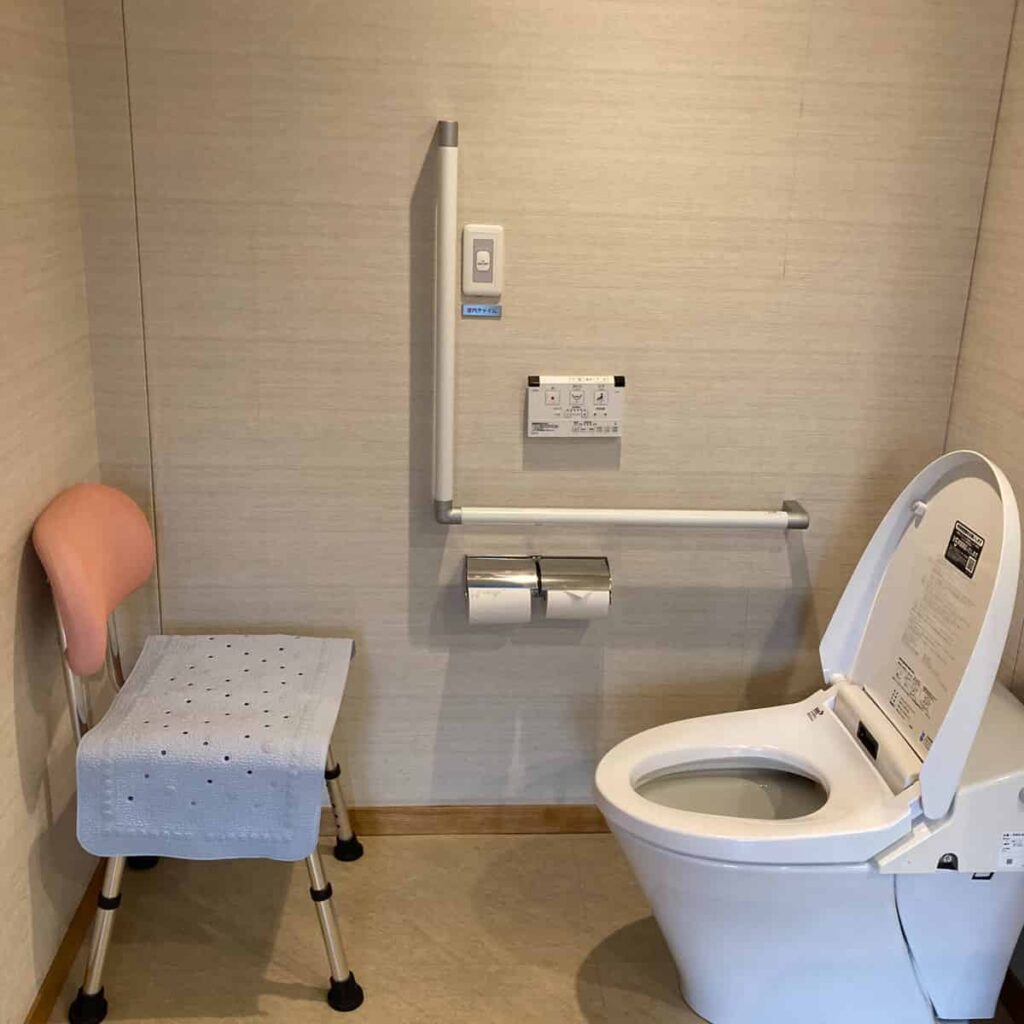 トイレには手すりがついていて、お風呂用の椅子もありますので部屋のお風呂に入る時も安心です。