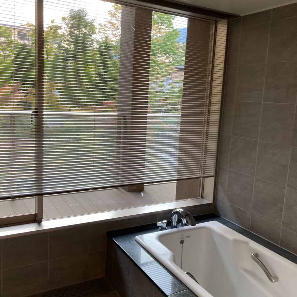 このお部屋は露天タイプではありませんが、中庭を眺めながら入浴することができますよ!